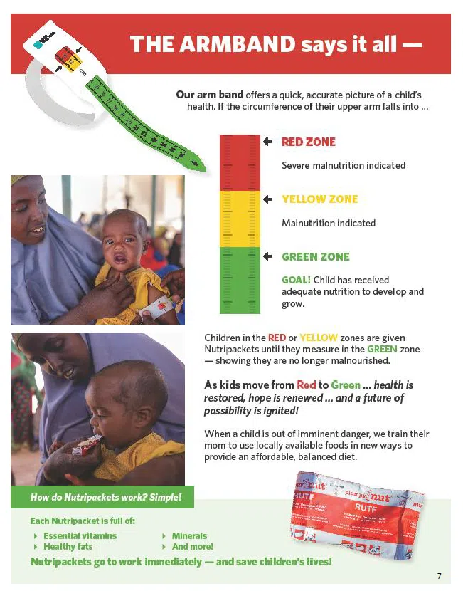 Children are assessed using a band to measure the circumference of their arm. If they measure in the green zone, the child is healthy. Yellow means malnourished, and red means severely malnourished. Many of the children being reached are measuring in the “red zone” and are severely, dangerously malnourished. With so many hungry children, much help is needed.